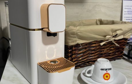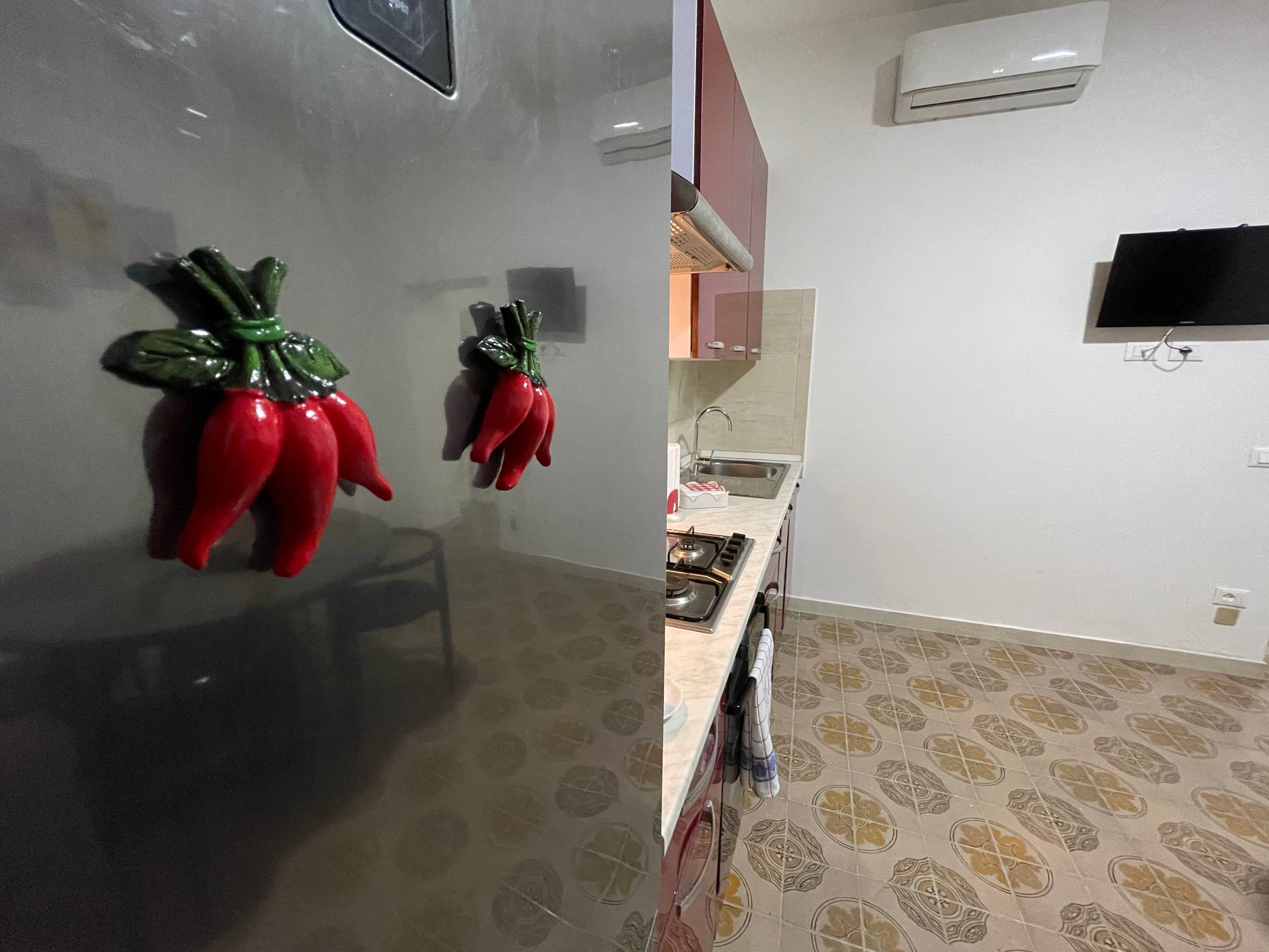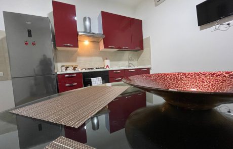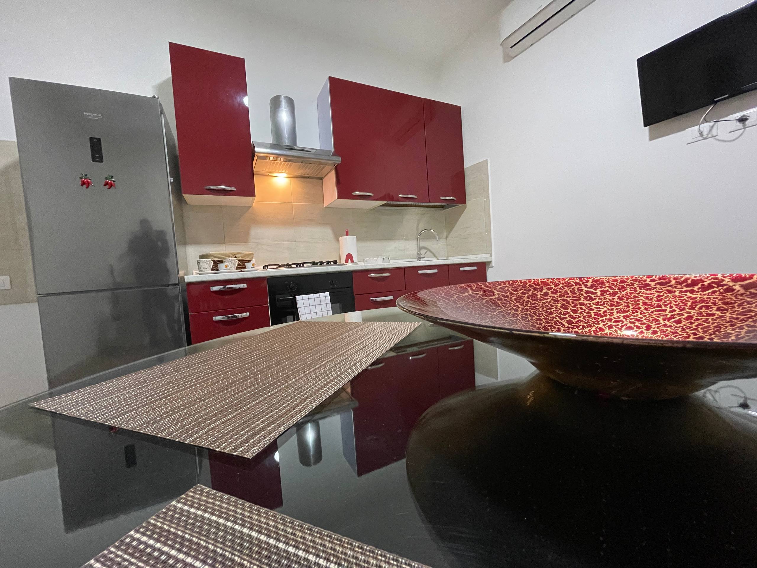 La zona giorno è organizzata in modo funzionale e raffinato. L’angolo cottura è completo di piano cottura a gas, frigorifero con freezer, macchina del caffè elettronica a capsule e tutto il necessario per cucinare. Al centro dell’area living si trova un elegante tavolo circolare in vetro e legno, elemento distintivo dell’appartamento che contribuisce a creare un ambiente luminoso e curato. La TV e la climatizzazione dedicata rendono questo spazio ideale per rilassarsi dopo una giornata al mare o una passeggiata sul lungomare.